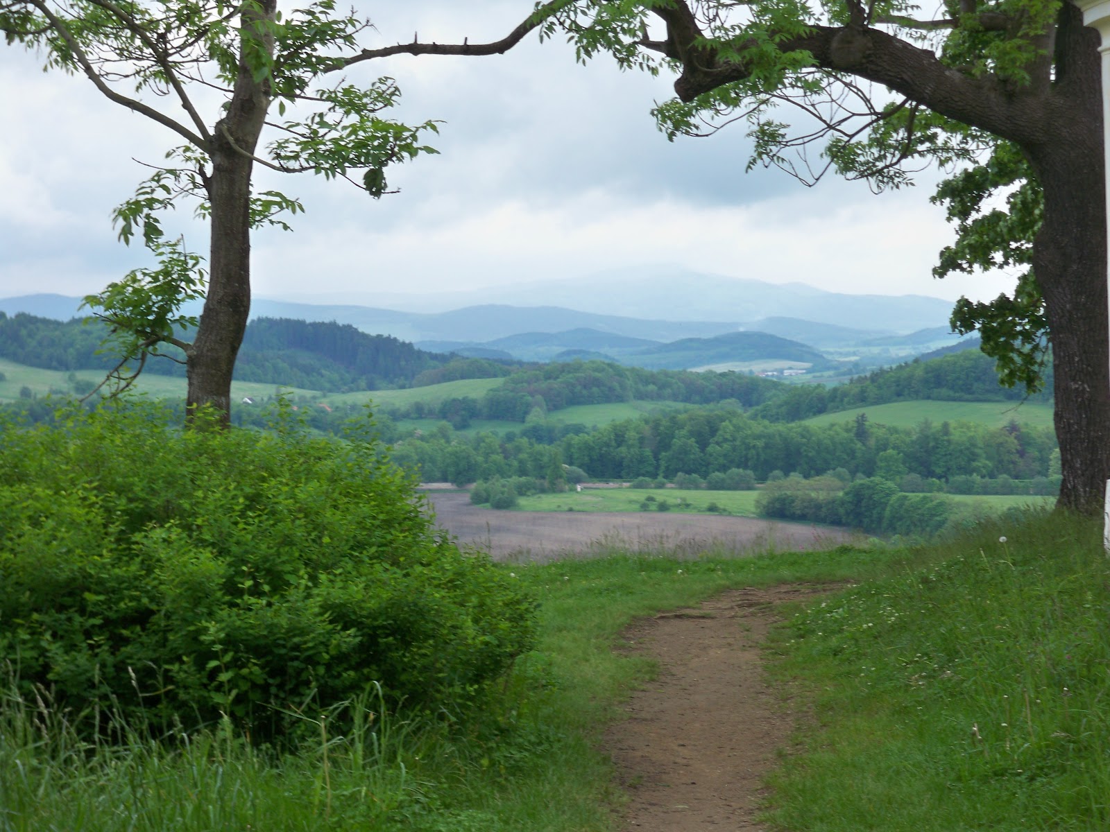 A change of scene is not always possible, so in its place, a change of screen. I choose a photo of a hike we took in the Czech Republic, high above the town of Czesky Krumlov. The Vltava River flows below, out of view in this photograph. And the hills that rise in blue infinity, those are the Sumava Mountains of Bohemia, in the heart of Europe.