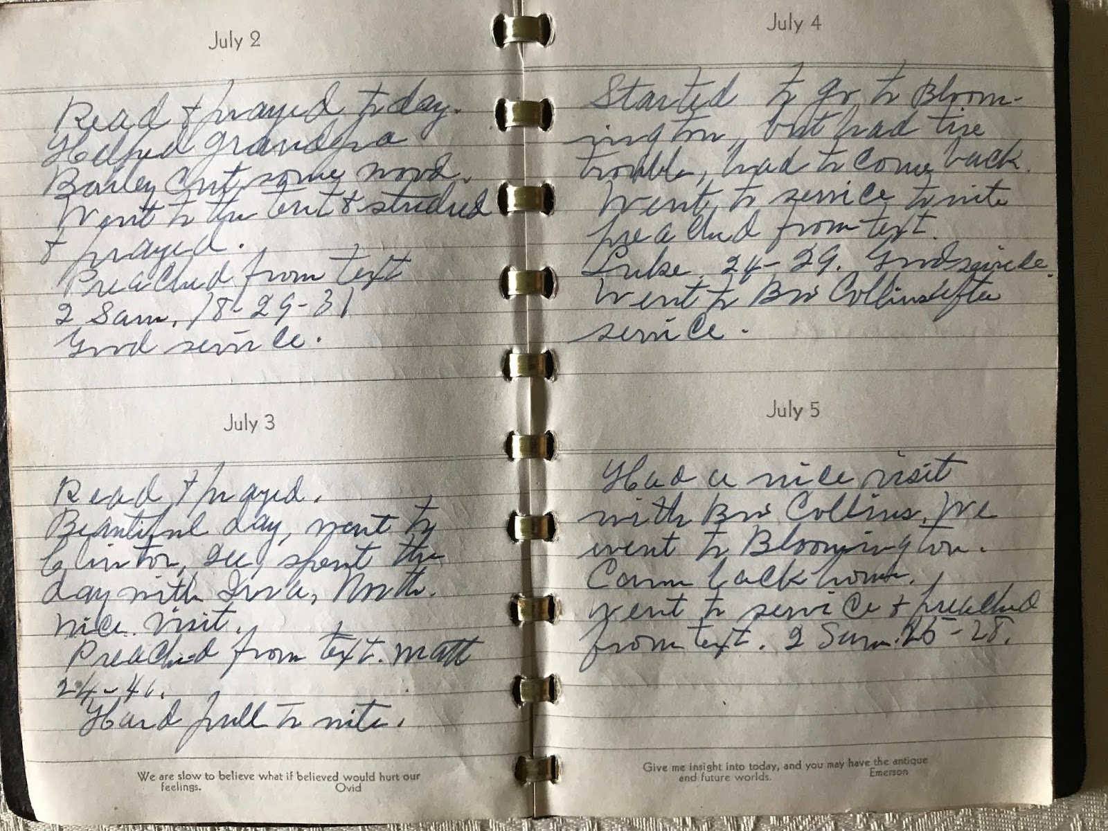 I found an old journal in the back room of my parents’ old house, my grandfather Cassidy’s diary from 1940. This is my father’s father, who I never knew; he died before I was born. He was a Nazarene preacher, and much of this diary records his prayer habits and the texts he preached from.