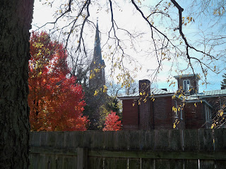 On my way home from the funeral Saturday, I stopped for a moment to snap this shot. It is a view of downtown Lexington from the parking lot of St. Paul’s Church, where Tom and I were married. I turned my head and there it was, this vision of old Lexington with the bright sun overexposing the steeple and the red brick rectory shining by its side and the late autumn foliage adding a spot of color on the left.