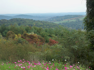 The whole outfit was thrown together; there were no permanent structures on that hilltop. You could easily imagine the way it will look a few weeks from now, windswept and golden, picked out and past peak — but still lovely. It is the view that makes the place, and that’s not going away. Mountain after mountain as far as you can see. And, at least yesterday, still-flowering cosmos softening the foreground.