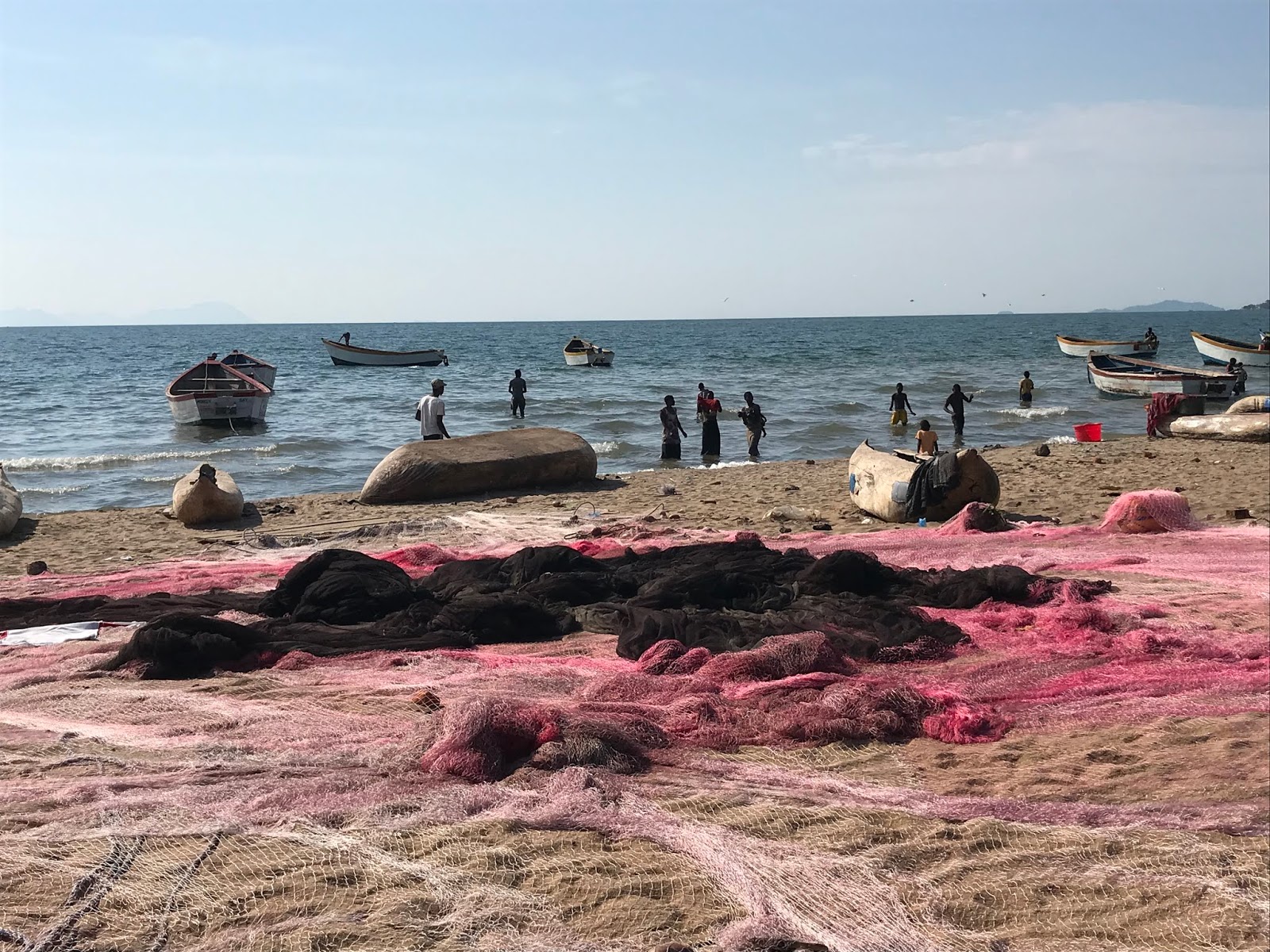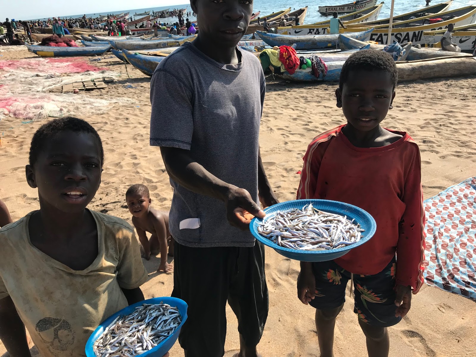 Lake Malawi is ocean-like in its long beaches, and I walked as far down as I could in one direction and almost as far as I could in the other. It was a “working beach” with only a few tourists. I saw fishermen mending their nets and women washing their clothes. I saw children carrying bowls of silvery sardines for sale. I’m squeamish about dead fish but these were beauties.