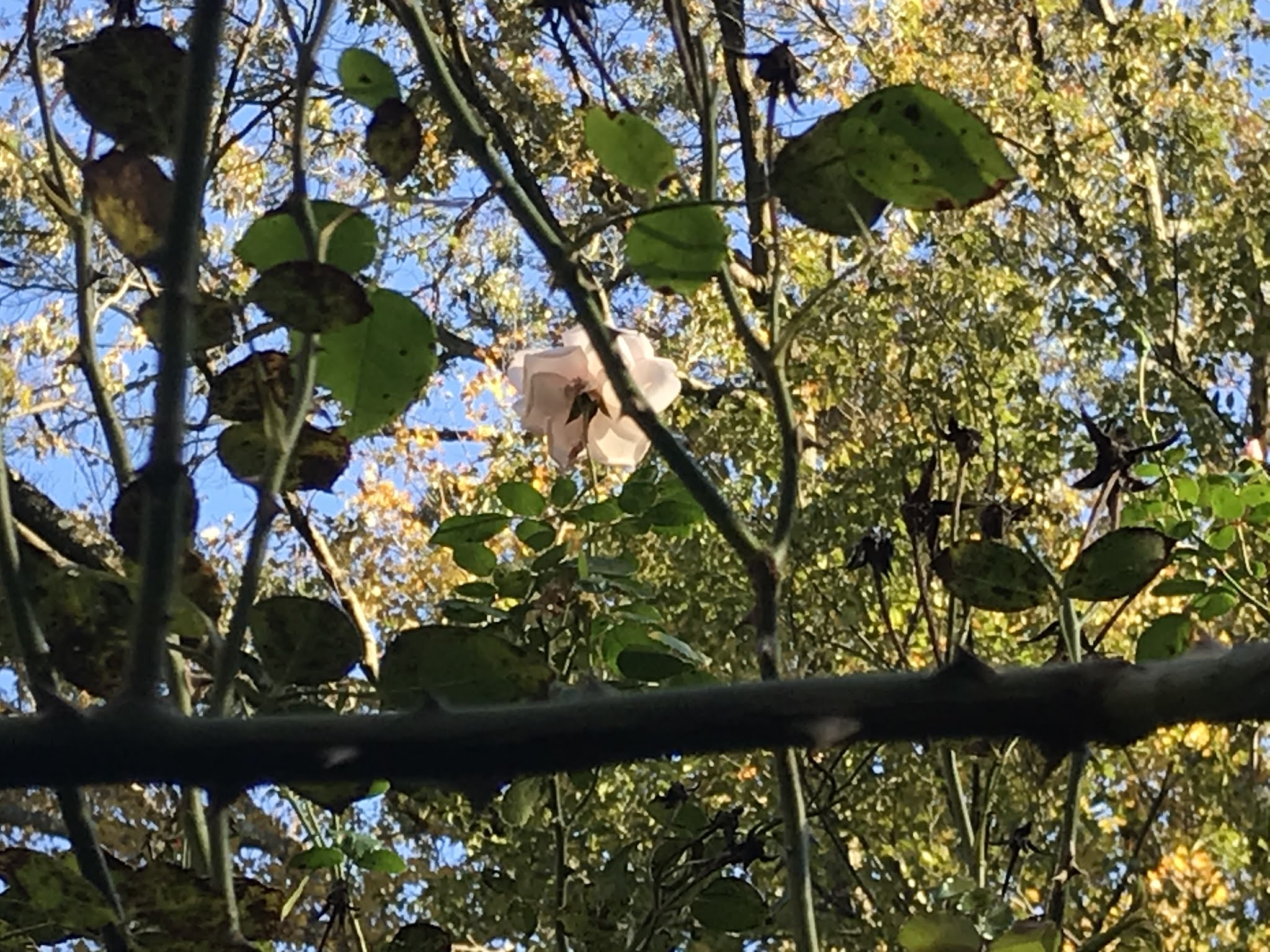 Yesterday, hoping that my candidate will prevail, I took comfort in the fact that the climbing rose is still producing lovely, creamy pink flowers — even this first week of November.