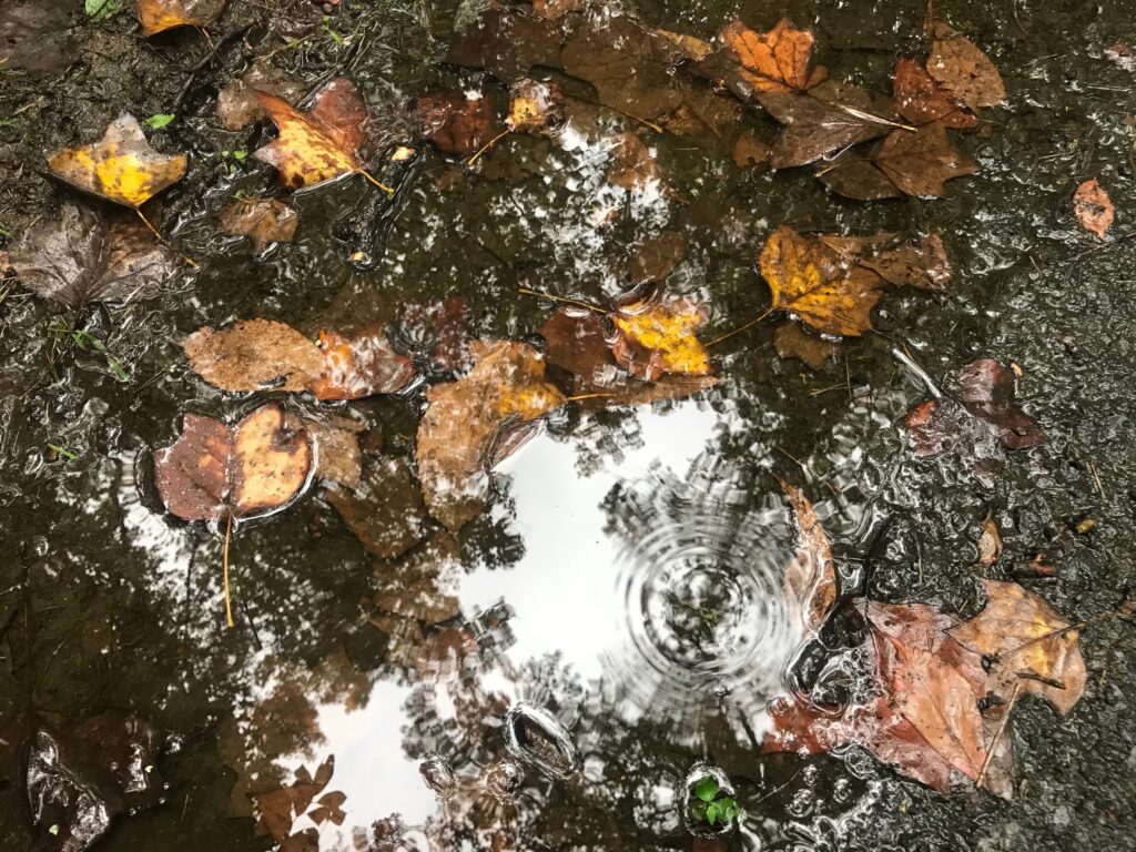 (On a woods walk last year, I noticed how a drop of water disturbed — and beautified — a puddle.)