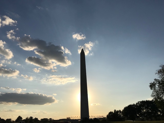 The monument was closed, then opened, then closed again. It’s been three years since anyone was allowed up in it, but it’s back in business today. Coincidentally, I happened by the monument last evening, just in time to snap some shots of our spiffed-up national icon.
