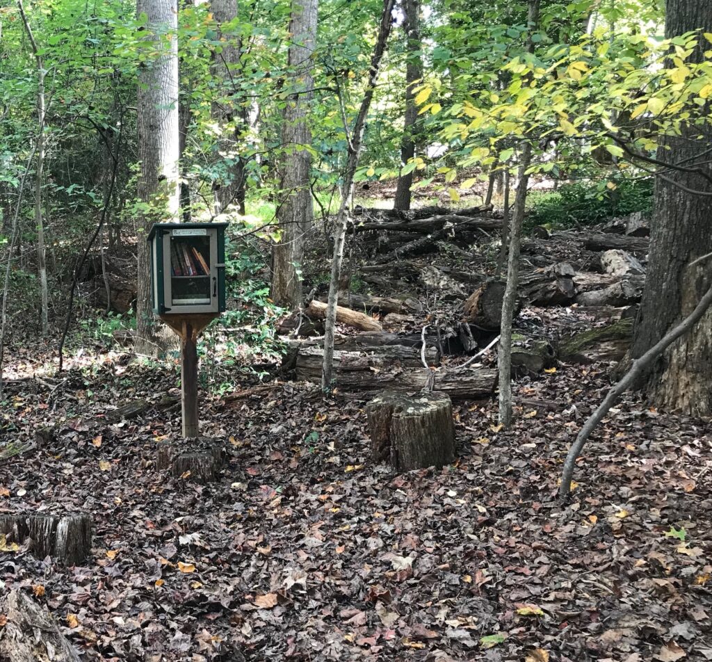 Most Little Free Libraries are stationed on suburban lanes, but this one is accessible only on foot. Only walkers can partake of its bounty, which seems to improve its stock.