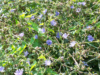 On a walk down the West Ox path today, one stretch was lined with wild chickory, the blue flowers nodding over the path, almost crowding me out. I felt like I was strolling along a flower-strewn walk in an English country garden. The wild plants will do that to you, will mimic, with their colors and arrangement, the artlessness of the planned landscape.