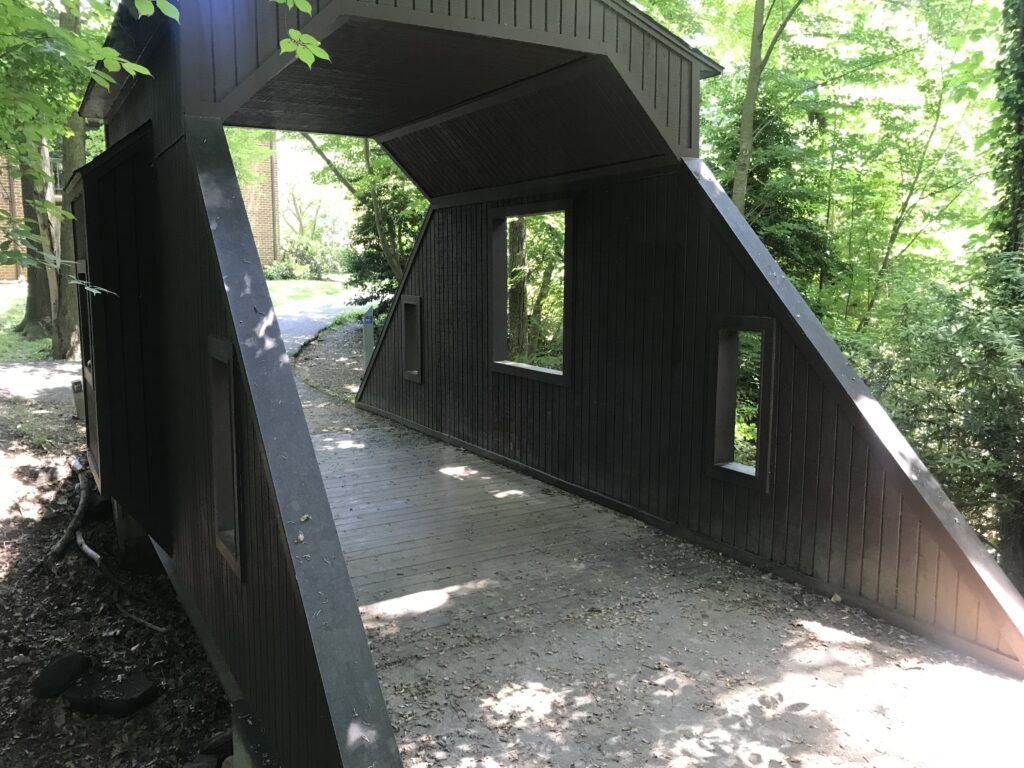 This bridge is on that route, a bridge to nowhere, you might think, though that wouldn’t be exactly right. It’s only a short pedestrian bridge, doesn’t span a great river or even a shallow canal, but it brings me full-circle from the community center, where my yoga class is held, back to my car. A bridge to somewhere, after all.