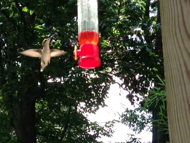 In the last two weeks I’ve sat close enough to hummingbirds to hear their wings whir and their brave little cheeps, to see them dodge bees as they angle toward the feeder. I’ve watched them fly off, sated (at least for 10 minutes), to perch briefly on the dead limb of an otherwise living red oak.