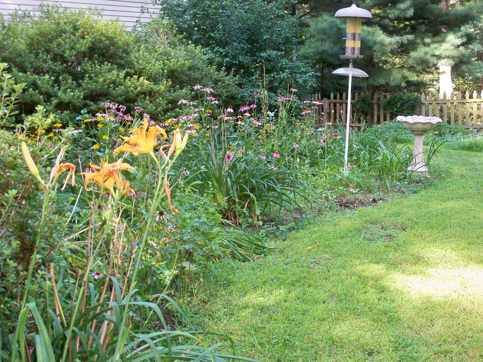 As for us, we’ve had orange day lilies, yellow black-eyed susans and pink coneflowers all together, and, if you look at them from the right angle, you can see a purple hydrangea in the foreground, too. These bright mingling hues are enough for now. They are meant to go together; they are pleasant on the eyes.