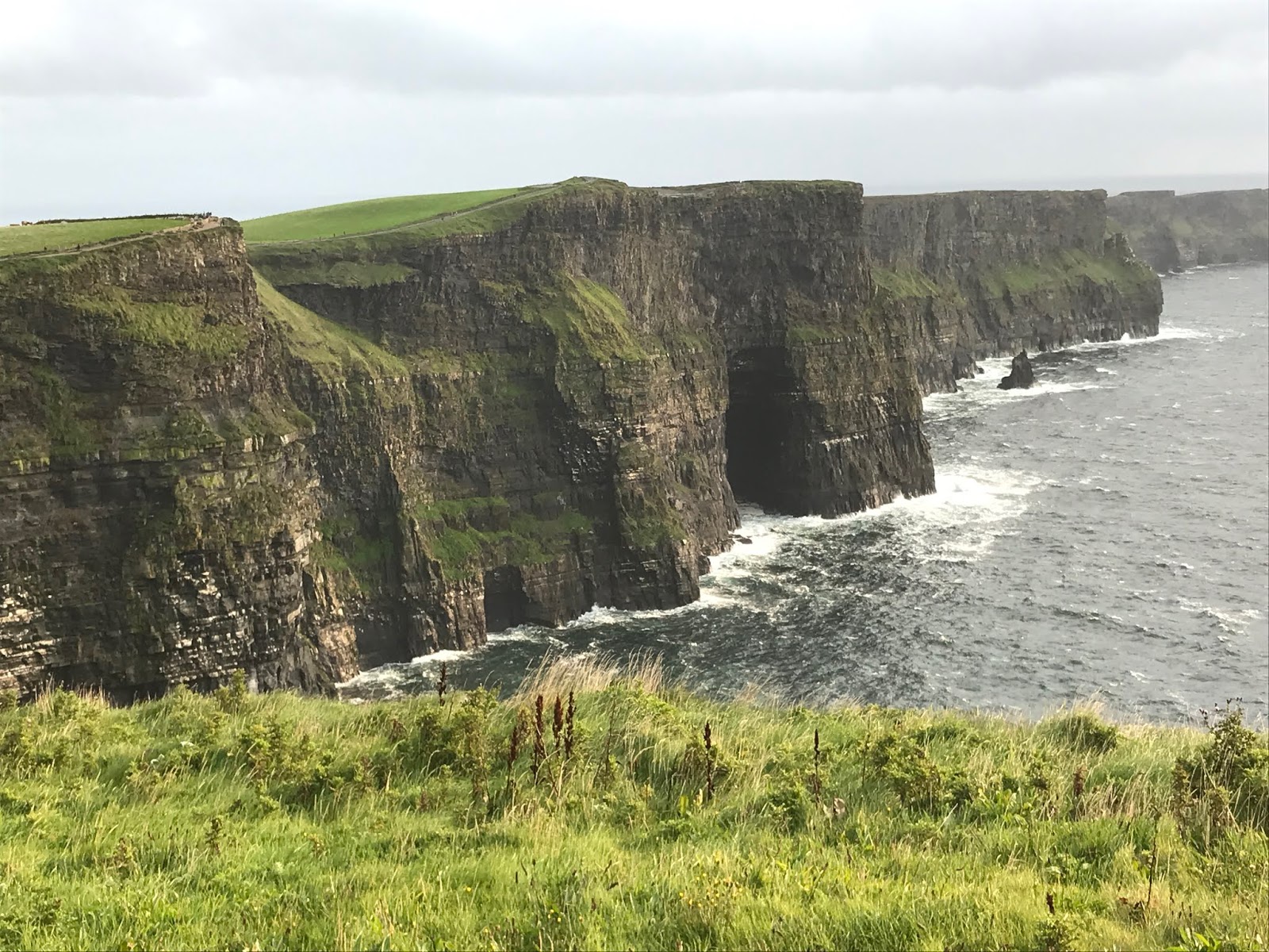 Yesterday it was the Cliffs of Moher in County Clare, home to my Long relatives. (I saw the old road to the house of the bachelor uncles Mom and I met so long ago.) The Cliffs of Moher were being buffeted by what felt like 50-mile-an-hour winds when we arrived. I was afraid they’d blow my phone out of my hands or me into the drink.
