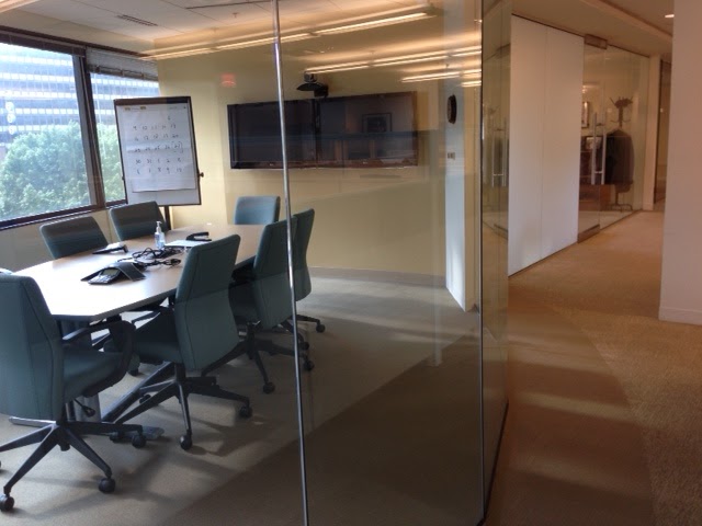 The glass begins in the lobby, where two sets of clear doors must be pushed or pulled to enter or exit. The lobby is so bright that I slip on my sunglasses the minute I step out of the elevator.