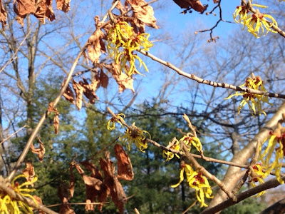 The witch hazel has been poised like this for weeks. Half in autumn, half in spring. Some of the branches blooming, others not.