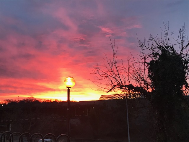 It’s a good time of year to look up. I snapped this shot just before getting on Metro yesterday. It was later than I would like to have been leaving, but it gave me the chance to see the sky on fire.