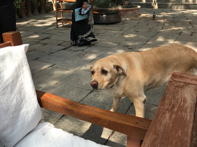 This morning I spotted a new friend at the hotel, a dog named … Maya — which astute readers of yesterday’s post will recognize as the name of the safa tempo driver I described yesterday. It’s a lovely name and this seems like a lovely dog.