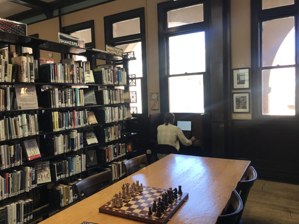 In this gracious two-story building, you can find newspapers on sticks, chess boards on tables and an elegant stairway to a bustling second floor.
