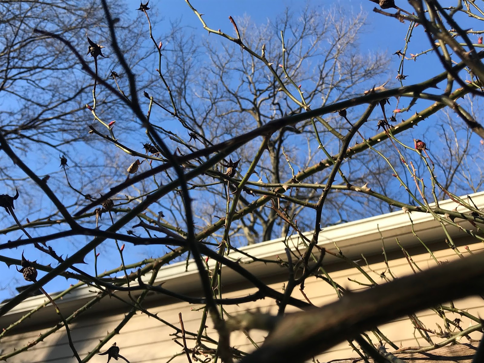 It’s not mindless but mindful. It requires that we study each stem, follow it through a tangle of thorns and the green gardening wire I use to lash errant branches to their railings. It’s almost like entering the plant, learning its secrets, understanding it enough to diminish it, knowing that in making it less we ultimately make it more.