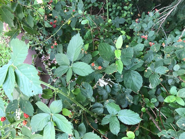 I see this berry patch often on my walks; it’s hiding in plain sight, tucked between two evergreens up against a guardrail. I’ve tried to take each stage as it comes, to enjoy the ripening process. But I’m bedeviled by two questions: When can I eat the little guys? And will the birds get them first?