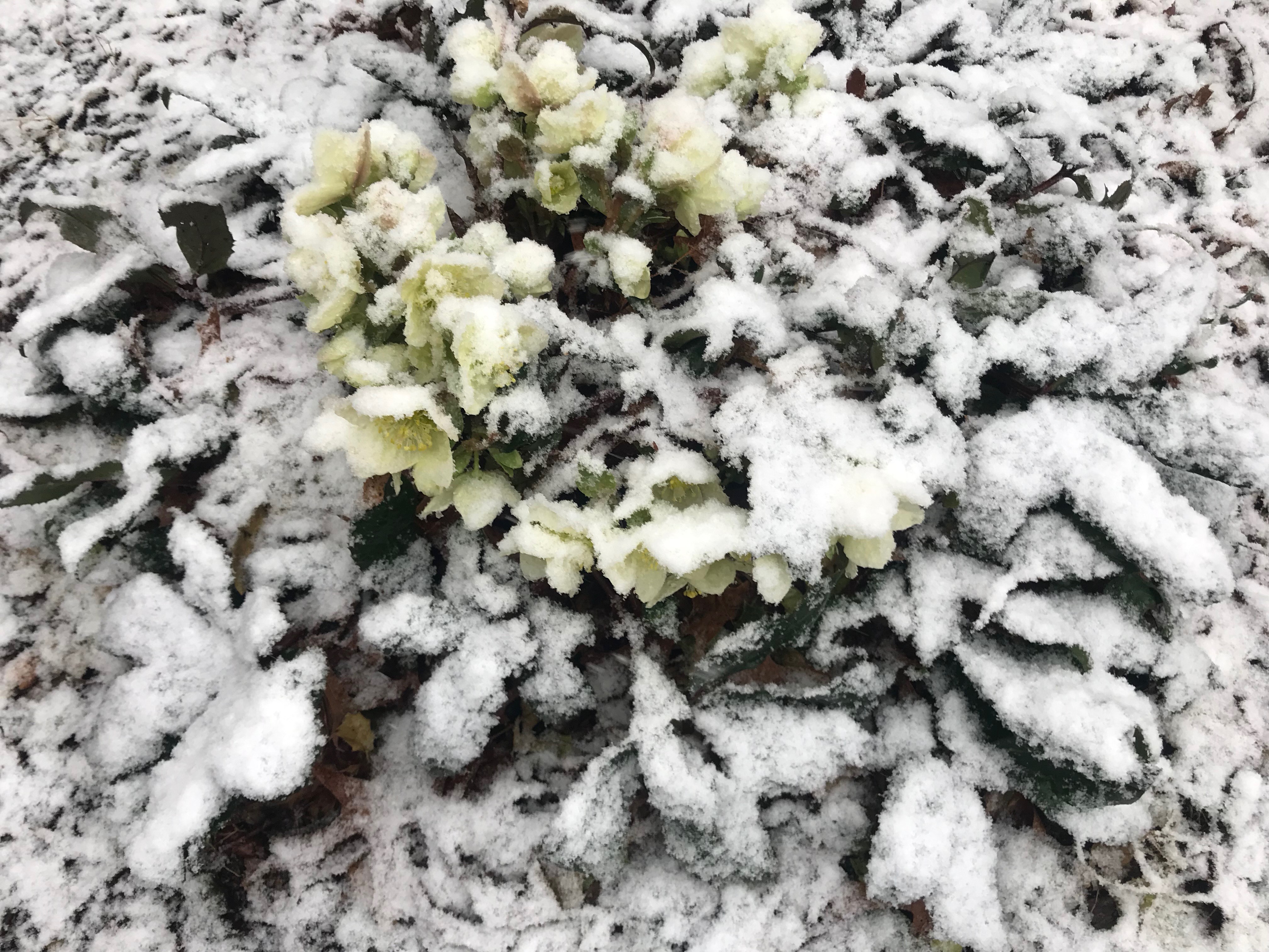 When I returned home, soaked and cold, I snapped this shot of the lenten rose, its creamy white blossoms nearly smothered by clumps of snow and ice.