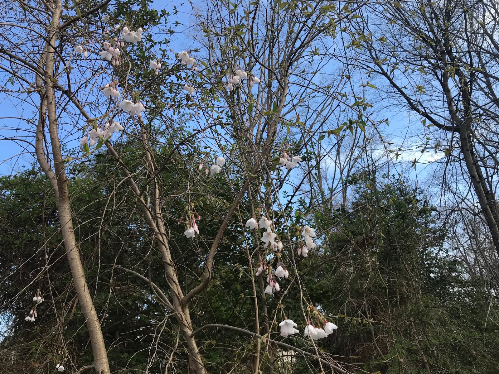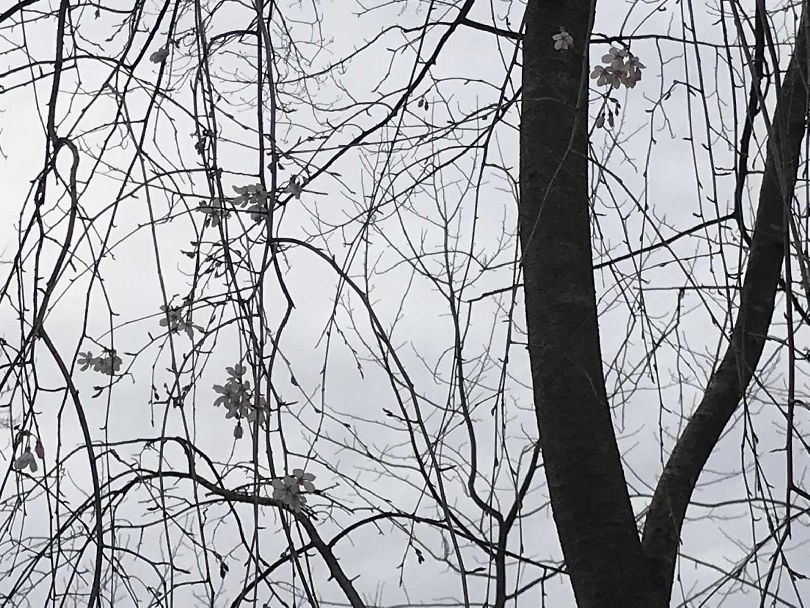 On a walk yesterday I spotted these well-spaced blossoms, which are part of an uncultivated weeping cherry, I think. There’s a tree like this at the end of our yard, too, though until the last few years it had no space to bloom.