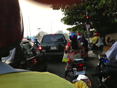 (Rush hour in Cotonou from the back of a zemidjan.)
