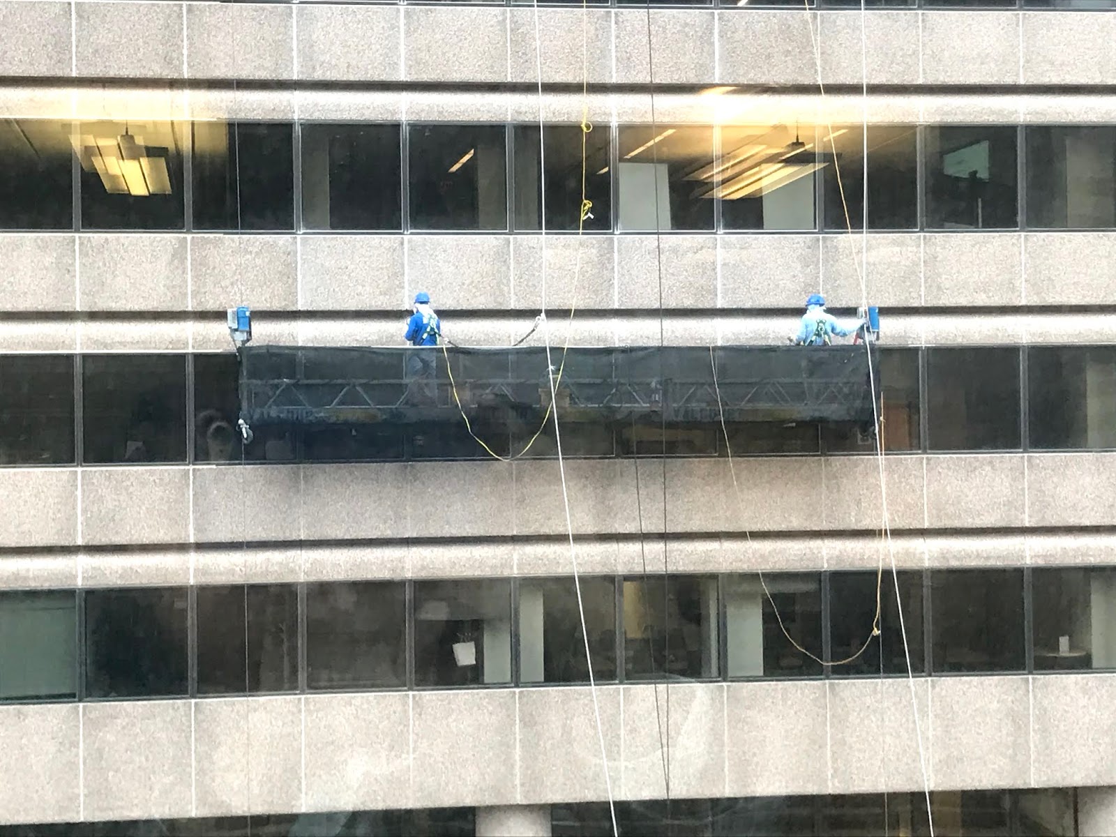 Of course, what they mostly do, what absorbs my attention when I’m in between tasks and “resting my eyes,” is hang off the side of an 11-story building. Right now, for instance, they are almost at the top, swaying in the breeze on a little platform with only a few ropes to hold them up.