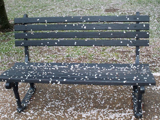 Blossoms fall from the trees, cling to sidewalks, cars — and park benches, too.