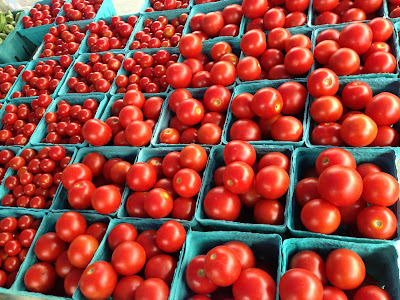 A quarter-mile down the road I dodged off into the woods, where the path skirts the lake and runs alongside tall marsh grasses. Up a hill, down a hill. Looping back to the plaza and the market, which was in much fuller swing an hour later. All the while thinking of the tomatoes for lunch, the zucchini for dinner and the strawberries for breakfast.