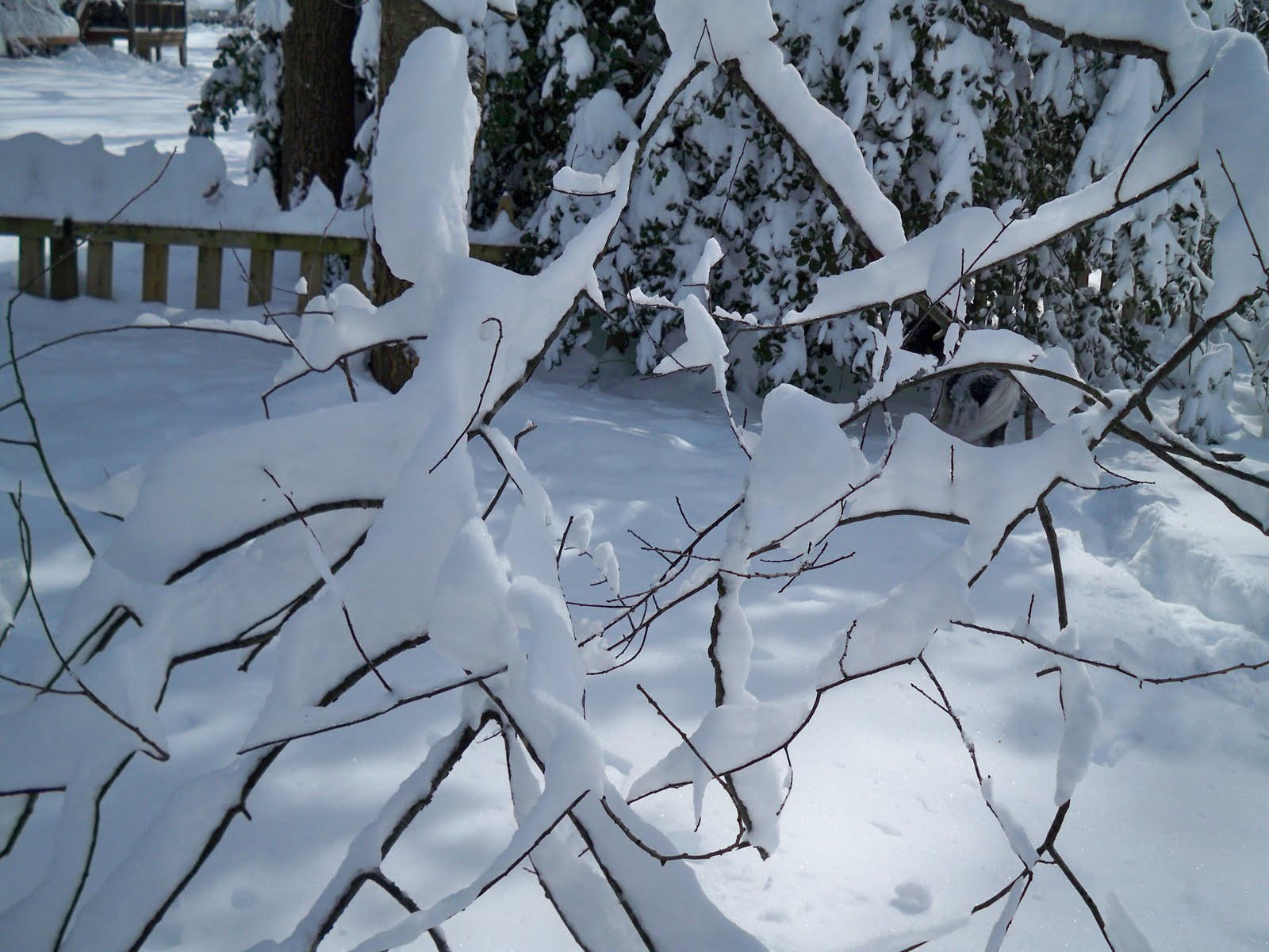 Through the quick-darkening afternoon and evening we heard claps of thunder, saw lightning flash. By midnight it was over. The west-facing flanks of trees were smeared with white, as if from a wayward paintbrush. Our bamboo was bent with the weight of the heavy snow. Today it is quiet, no plows, no cars. Just the whiteness of a spent world. Until yesterday we’d had a cold, dry winter. The thundersnow made up for it.