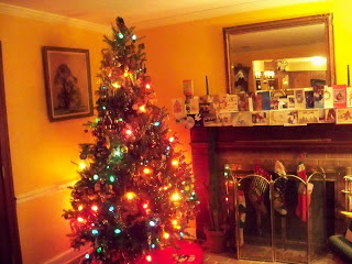 Last night we put up the tree. We’ve inherited two blue chairs since last year, so we had to move those to make room. The plug we usually use for lights hasn’t worked in months, so we jerry-rigged extension cords for illumination.