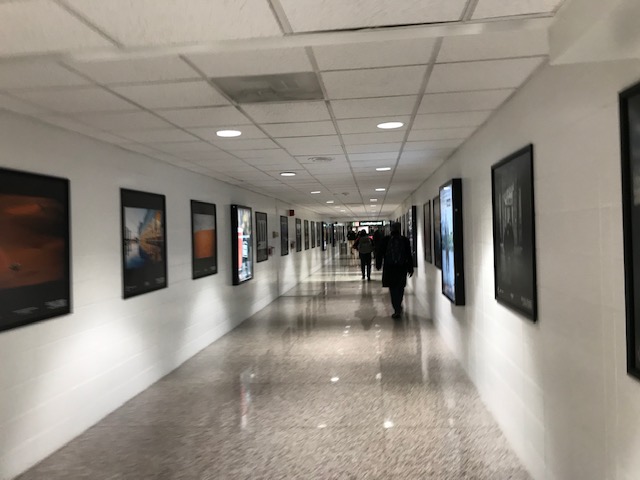 It’s a warren of passages, steps up and down. I passed a barber shop, an optician, a branch library and an experimental theater. I walked down a hallway with art on the walls.