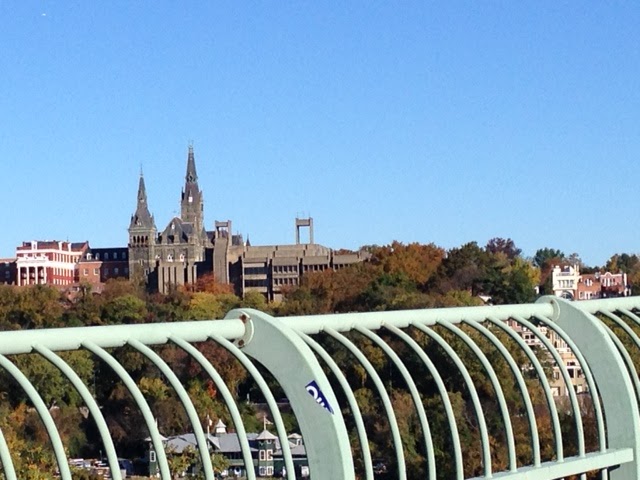 Friday’s weather was brisk. I wore a jacket and scarf. I considered gloves. But none of this mattered once I started across the span. There are the spires of Healy Hall ahead, and beside the campus the narrow, treed lanes of a much older city. Below is the Potomac, and, if you’re lucky, a crew team skimming across it. The bridge is clogged with trucks and cars and bikes. All is movement and brightness and wind.