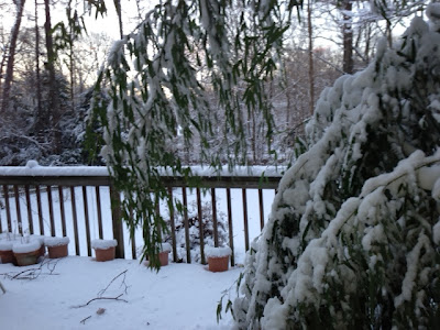 The bamboo hangs its head, weighted with the white stuff. Maybe the winds will blow it clean.