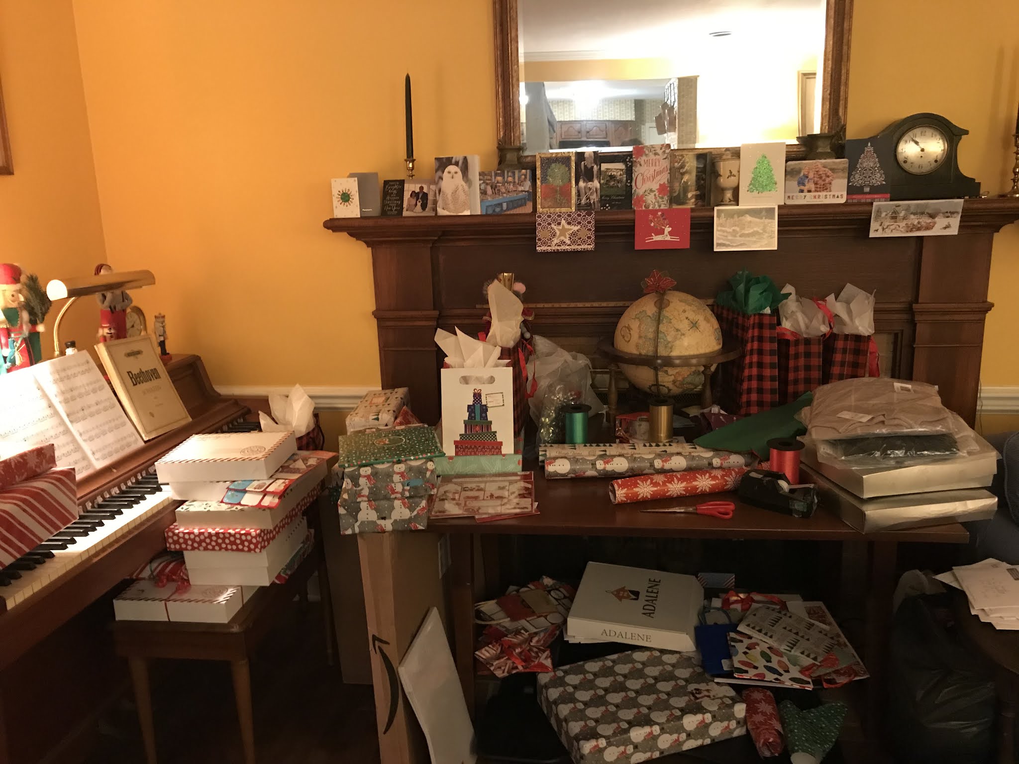 And to that end, herewith another holiday post. This one is just to note that this year, rather than wrapping gifts upstairs, leaning over a bed (which was how Mom did it, and usually between the hours of 5 p.m. and midnight on Christmas Eve), I used the dining room table, which since the arrival of the ‘new” couch in May 2019 has been pushed in front of the fireplace.